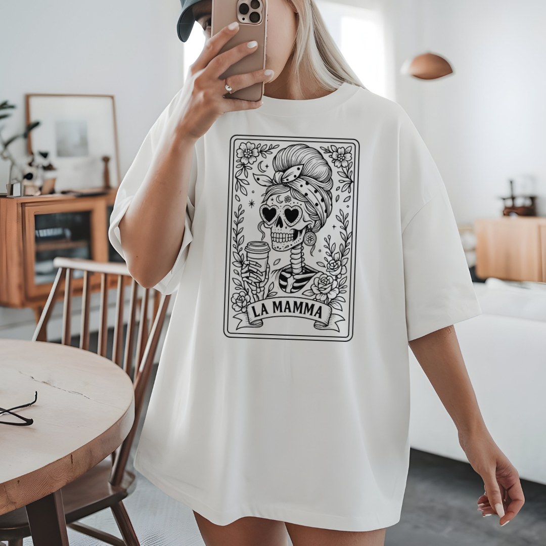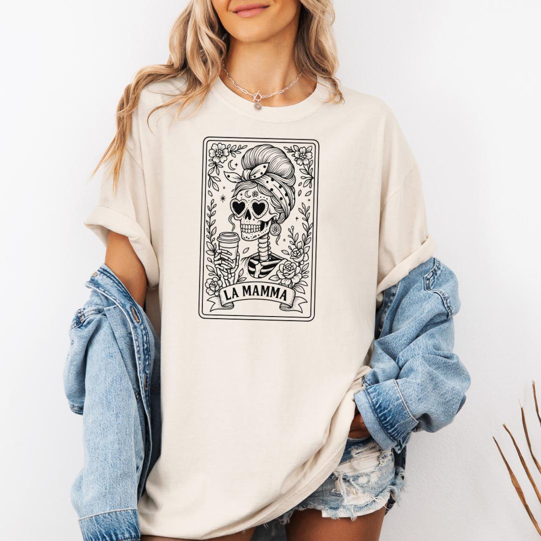 Our bold La Mamma design fuses Day of the Dead vibes with espresso-fuelled sass - it's a love letter to fierce, fabulous moms who run the world (and the carpool). Whether you're serving looks or lattes, this tee does both. This extra soft t-shirt blend has a vintage-style quality to the colours which we are in LOVE with.